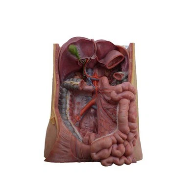 Овај модел приказује унутрашњу анатомску структуру трбушне шупљине. Танко црева је окренута бочно да би се показала супериорне мезентерске артерије и вене, јетра је постала у потпуности откривају унутрашњу структуру мањег оментум вреће и стомака, панкреаса и попречних дебелог делова и преступнике дебелог црева и престане показују порекло и крај супериорне мезентеријске артерије и вене. The internal structures shown include: the costophrenic recess, left lobe of the liver, right lobe of the liver, caudate lobe, quadrate lobe of the liver, round ligament liver, falciform ligament of the liver, triangular ligament of the liver, bare area of the liver, diaphragm, gallbladder, celiac trunk under the lesser omentum, left gastric artery and vein, superior adrenal Артерија, дијафрагматични ЦРУ, трбушна аорта и инфериорна вена кава, портал вена, правилна хератијска артерија, жучан канал и слезина. Сплениц артери и вене, леви и десни бубрези, бубрежна артерија и вена, инфериорни месентеријски вен, дуоденум, панцреас пресек Анатомија, превладавање дебелог црева, лево флексибилно флексибилност дебелог црева, десно дебело црево, деконо дебело црево, целоводно дебело црево, целоводно, десно, наводећи се у дебелом црево, цело црно, целуте, илеиор, претворило се у десној страни и илеуму, претворило се у дебело црево, јејунум и илеуму. Абдоминални зид је одбачен да покаже инфериорну епигастричну артерију и вену, средњи пупчани преклоп (и атетску храброј) и (и атетску пупчану артерију) и (и атретску пупчану артерију), спољну кожу, поткожну масноћу, спољни коси мишић, интерни коси мишић, попречни трбушни мишић, пресек ребара итд. |
