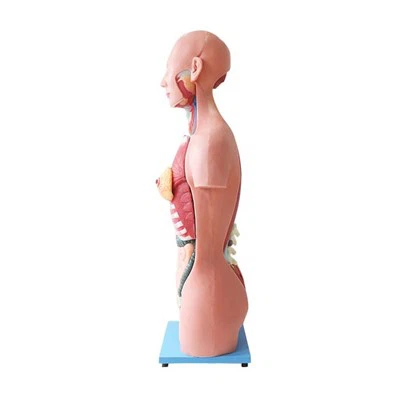 Меког силиконског анатомског торског модела је приказује положај унутрашњих органа људског тела и анатомског облика и структуре главе, који представљају три система дисања, варења и мокраћног система. Десна половина лобање приказује структуре попут лобање, мишића МАСТЕР и временски мишићи. У орбити постоје очне јабучице. Узми сагитални одељак на главу и врат. Кранијална шупљина садржи десну хемисферу мозга. На вентралној страни мозга има дванаест парова кранијалних живаца. Приказане су назалну шупљину, усмену шупљину и ларинкс. Паратироидне жлезде приказане су иза бочног режња штитне жлезде. Фронтални део два плућа у грудима приказује структуру плућа. Коронарна анатомија срца указује на структурне сличности и разлике леве и десне коморе. Кардиоваскуларни систем укључује горњу и доњу вену каву, плућну артериовенову и аорту за објашњење примене велике и мале циркулације крви. |